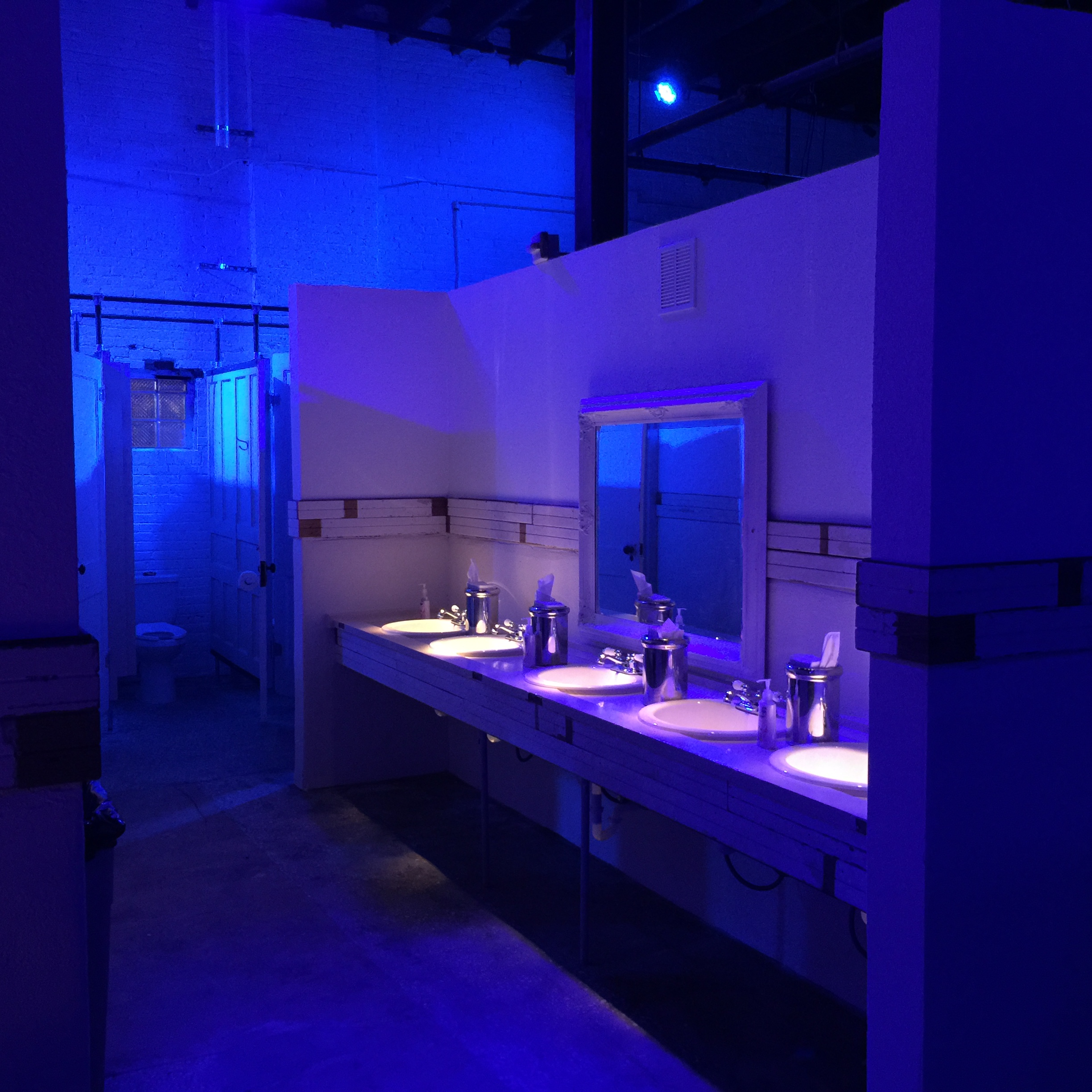 The "Biltmore Bathroom" Project: We designed this commercial bathroom renovation with 90% repurposed materials from the demolished Belleview-Biltmore Resort & Spa in Belleair, FL. The hotel was built around the same time as the building (District 3 | Arts & Events, Tampa, FL), so we wanted to keep the same feel of the era. Hotel room doors were used to make the entrance doors and dividers as well as the sink countertops. We also used original porcelain knobs that were salvaged from the hotel. The wainscoting was kept as-is and used as trim to separate the drywall from the concrete sections of the walls and to create a face for the sink counters. The minimal amount of wood we used to pice everything together was painted in the same color as the original paint on the doors. Speed rail fittings and iron pipe connect all the stalls together to tie into the warehouse feel of the venue.